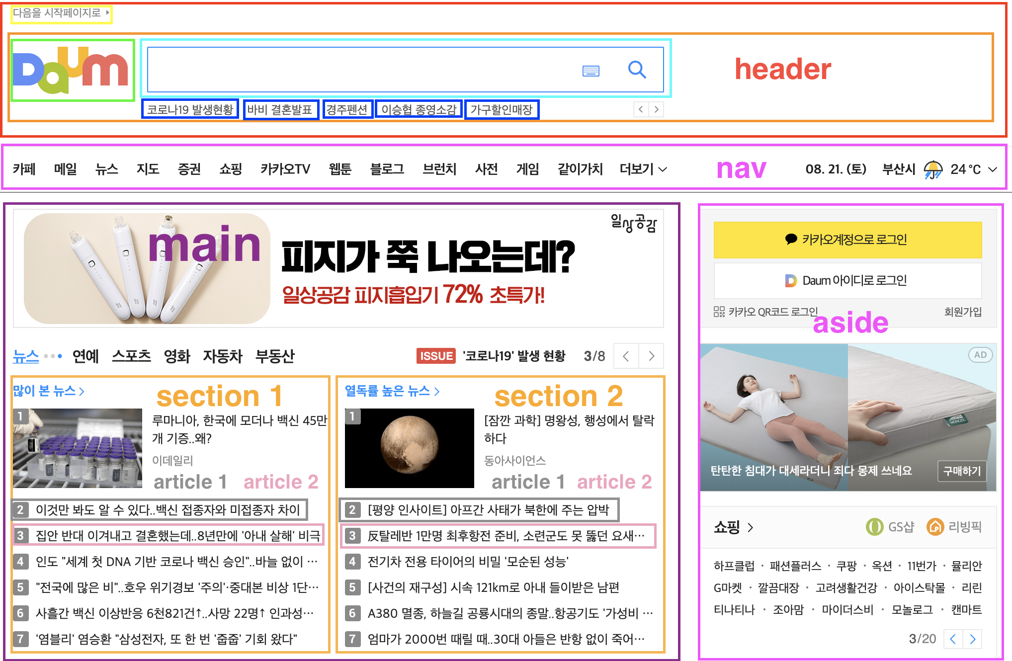 예전에는 데스크톱용 홈페이지만 만들었다고 하면 지금은 다양한 디바이스가 있습니다. .left { float:left; width:50% } .right { float:right; width:50% } html에서는 예전과 달리 고정된 px을 사용하지 않고 Flex grid %, Flex box vw, vh를 사용해서 구현합니다. 추가로 css에서 Media Queries를 이용해 모바일, 태블릿, 데스크톱 화면을 어떻게 보여줄 것인지 구성할 수 있습니다. 그래서 데스크톱, 태블릿, 모바일 화면을 생각하면서 만들어야 합니다. @media screen and (min-widht: 800px) { .container { widht: 50%; } }